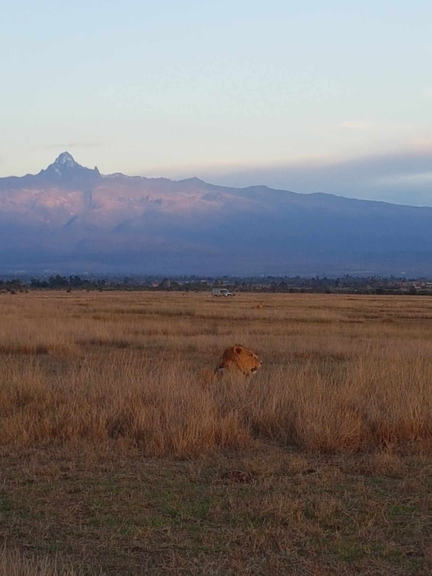 On many occasions at Ol Pejeta, we have been distinctly unsuccessful in seeing any of the big cats that reside there but on this occasion, we stumbled across five lions creeping through the long grass on the plains. We saw four females and a male lion and we had not realised it at first, but they were out hunting for their dinner. It was dusk and as the light fell, they worked methodically in a team to lure a warthog to its ultimate end. They were very obliging towards us and were lying in the long grass so close to the road that if I had had the courage to lean out of the car window far enough, I might have been able to touch a lion!