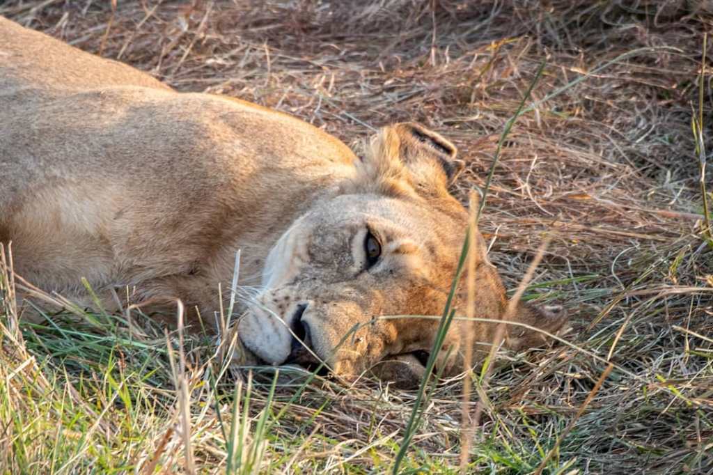 To our delight, we stumbled upon a mating pair of lions. A beautiful and muscular black maned male lion, mounting his subservient and compliant mate for a matter of seconds, tenderly nibbling her neck, before relaxing into the long grass attempting to recover some energy for the next covering. Lions mate every 20 minutes or so over a period of 3 or 4 days so this is quite an arduous process for both parties concerned! We were privileged to witness such intimacy in the wilderness although the lioness looked less than interested in the shenanigans.