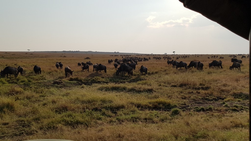 As our safari vehicle wound its way steadily across the rolling plains, we were able to witness millions of these wildebeest which really was an epic sight. They are quite scruffy, awkward looking creatures, with a scraggy mane which flows behind them when they are galloping along and they make constant grunting noises. Their numbers were remarkable and we were told by our guide, Francis, that we would attempt to catch the migration the following day. Their lolloping along kicked up significant dust clouds as if to give us a preview of what was in store for us. It was laughable how dirty we got just being sat in a car!