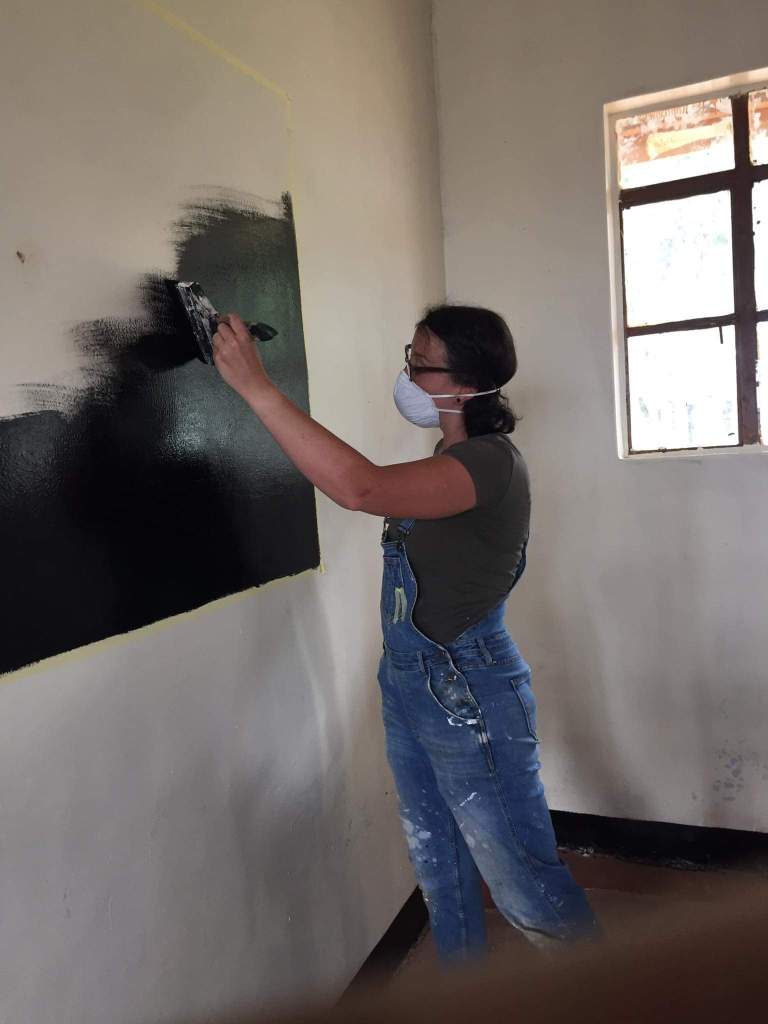 Once the cleaning had been completed, we set about painting each room in a bright yellow colour, and painting a solid black skirting band where the wall met the floor. We also re-painted the chalk boards. This took quite some effort to get straight lines! Our group was joined by some of the students who wished to get involved in cleaning up their own school and they proved to be extremely good workers. Their English was questionable but they mucked in without question and simply got on with all tasks.