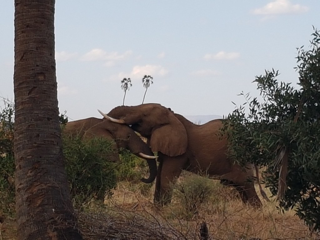 Upon our arrival at Elephant Bedroom, it became immediately apparent why the lodge has this name as there were two rather large male elephants mooching around the car park area. We were warmly welcomed by the staff members and informed that the two visiting elephants were known as Tom and Obama. We were astounded! The elephants were unbelievably close to us but unperturbed by us and gently rubbed each other with greetings, tenderly caressing each other, oblivious to our open-mouthed staring at them.