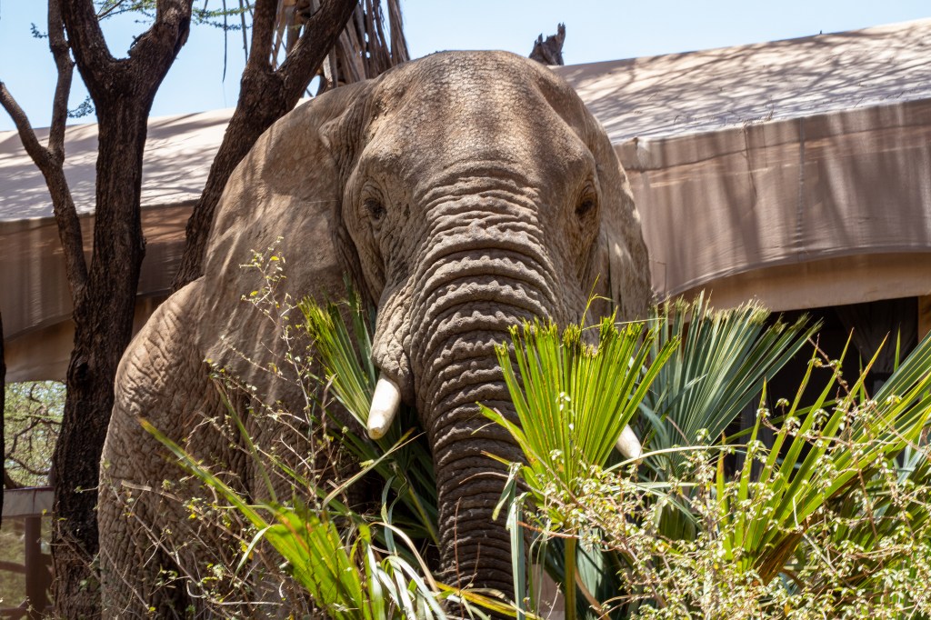As we readied ourselves to pop back out into the reserve, we were dumbstruck to note that one of the big elephants who had been by the car park when we entered, namely Tom, strolled past our lodge only metres from us and wandered through camp looking for a bite to eat. He sauntered to the neighbouring tent where our friends were staying and loitered in the bushes, steadily munching his way through the plants. We couldn’t believe our luck! Mr Nomad and I left the safety of our tent and snuck behind our friend’s tent, creeping underneath the stilted structure to observe the world’s biggest land mammal taking an afternoon snack. He was in touching distance and we were mesmerised.