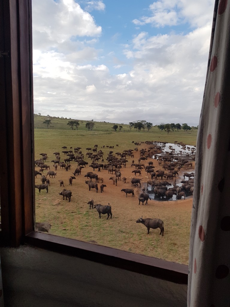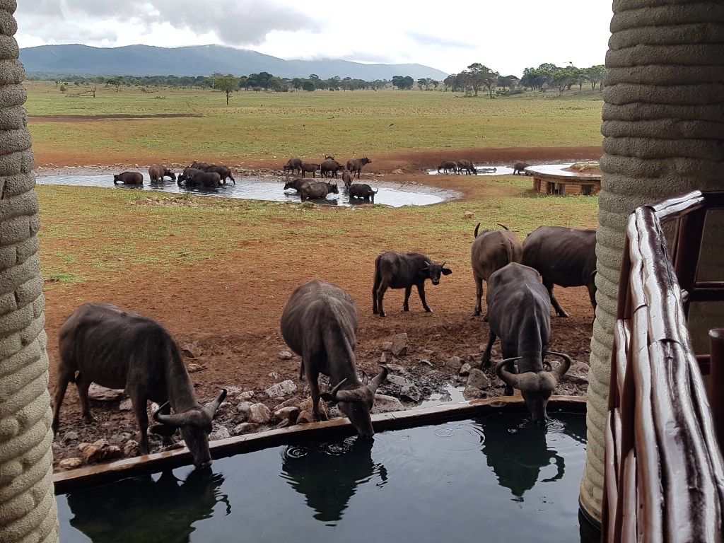 Upon our return to the Lodge, we were amazed to see that hundreds of buffalo had joined us and were hanging around the restaurant area. This was a joy! To see such wild animals getting incredibly close to us, lapping up the water from the watering hole only a matter of metres from us. It was astounding!