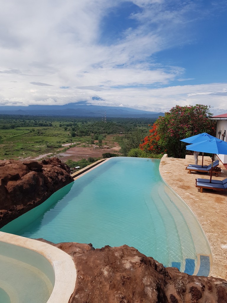 After the solemn and rather melancholy morning, we had a marvellous lunch at Grogans Castle Hotel close to nearby Lake Jipe in the shadow of Mount Kilimanjaro which provided some much needed relief before we were to proceed onto Salaita Hill for sundowners. The hotel was high up perched on a hill and the views were spectacular. We tucked into a sumptuous feast to prepare ourselves mentally for what was to come, and the physical challenge of climbing the hill itself. The vista was stunning although different to that at Salt Lick Lodge. We couldn’t see much wild life although the bushy green landscape was fantastic, with splashes of vividly coloured flowers but we could see the magnificent Mount Kilimajaro although it was shrouded in mist.