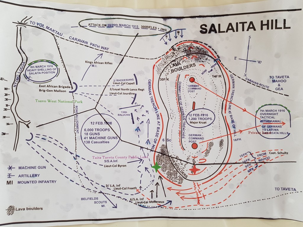 This hill became a tactical look out point close to the border town of Taveta and was a significant vantage point on the route for Voi, Maktau, Taveta and Moshi. It was strategically located on the savannah plains between Mount Kilimanjaro and the Pare mountains and was considered the gate way into Taveta and to German East Africa. It was very heavily defended and had quickly been occupied by the Germans and became a strong defensive position. The hill was attacked three times by the British who sustained very heavy losses. It was finally liberated after a lengthy artillery bombardment on 8th March 1916, the German forces having swiftly evacuated the night before.