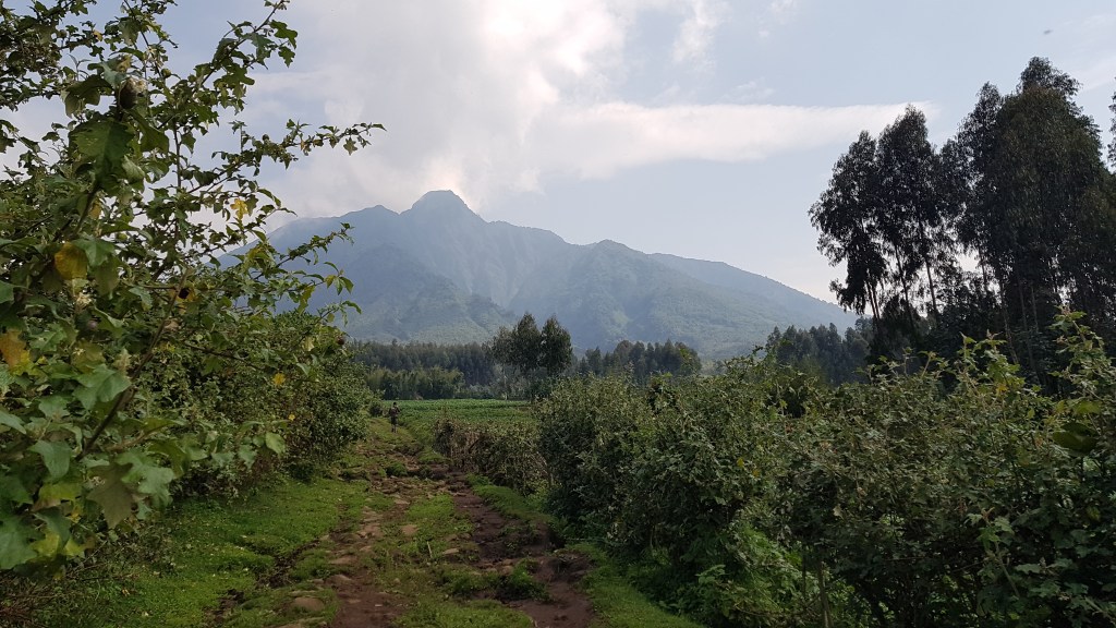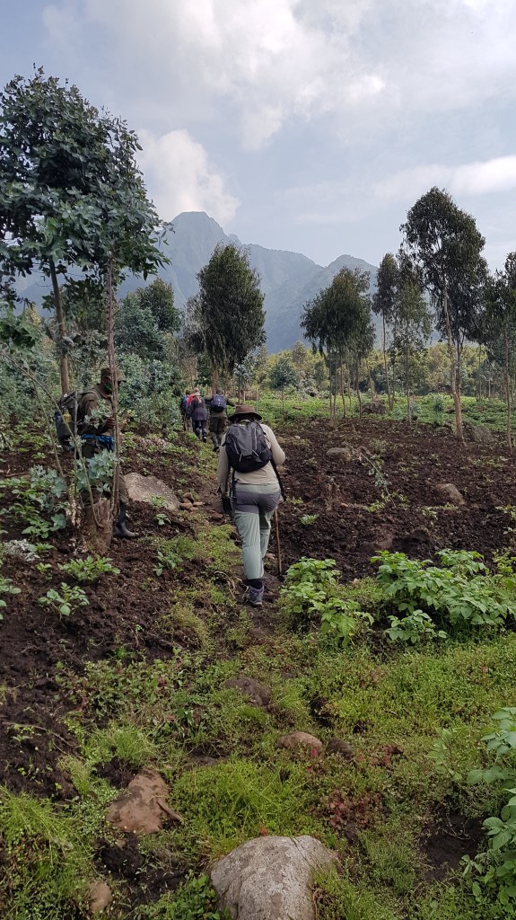 And so the trek began. The countryside was beautiful. It was lush and green, and as we made our way over the fertile farmers fields mainly growing potatoes, we were very much in the shadow of the imposing Mount Sabyinyo, approaching its lower slopes on the ascent to the rainforest to track the gorillas. It was humid and I felt instantly sticky, but it was not as searingly hot as Kenya is known for. It was not dusty at all but that’s not to say that I could breathe any easier in the altitude!