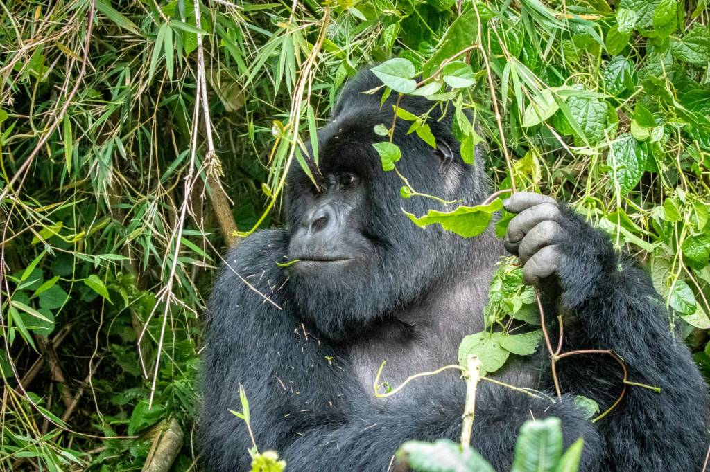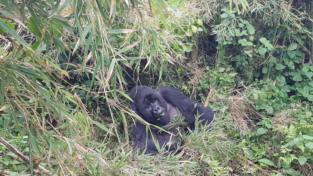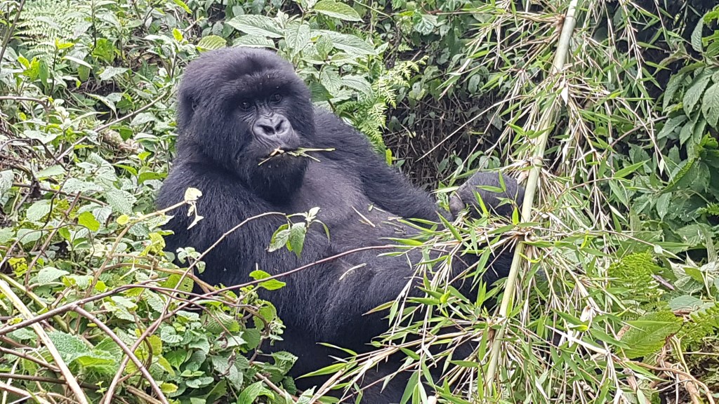 These gorillas wandered away, so the rangers led us to another gorilla, tucked into the bushes enjoying a bamboo breakfast. On the other side of the bush were two other gorillas – a male twin brother of the one I was viewing, lying down closely with a female. Mr Nomad edged closer to the male and female lying together while I watched the first male as he tucked into his hearty meal. I was transfixed! It was almost hypnotic, and as he savoured every morsel, I savoured my undisturbed sighting of him.