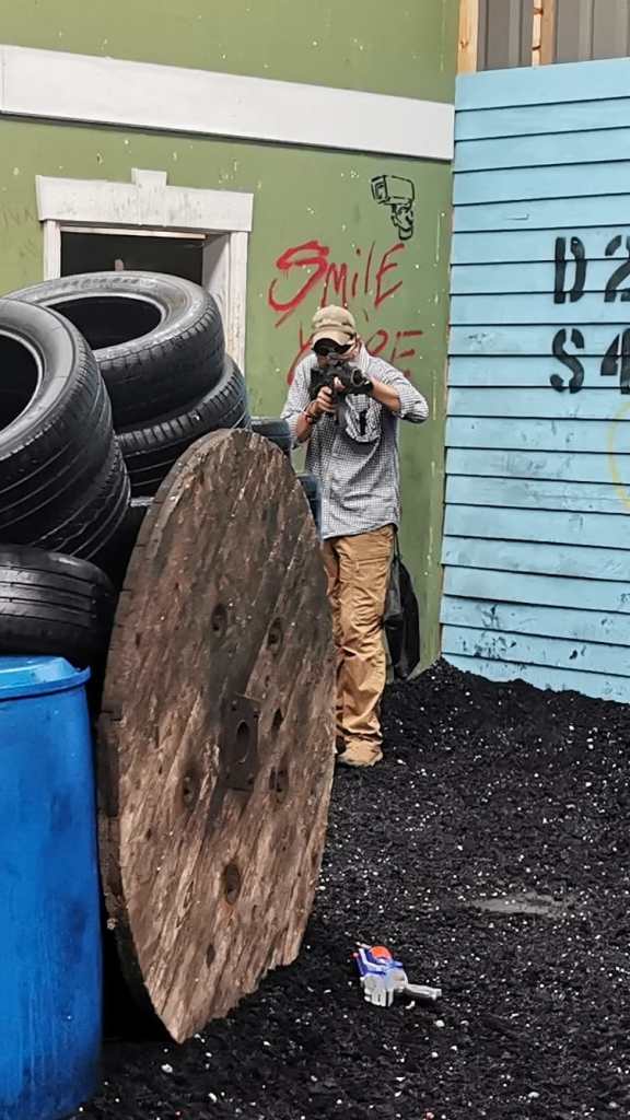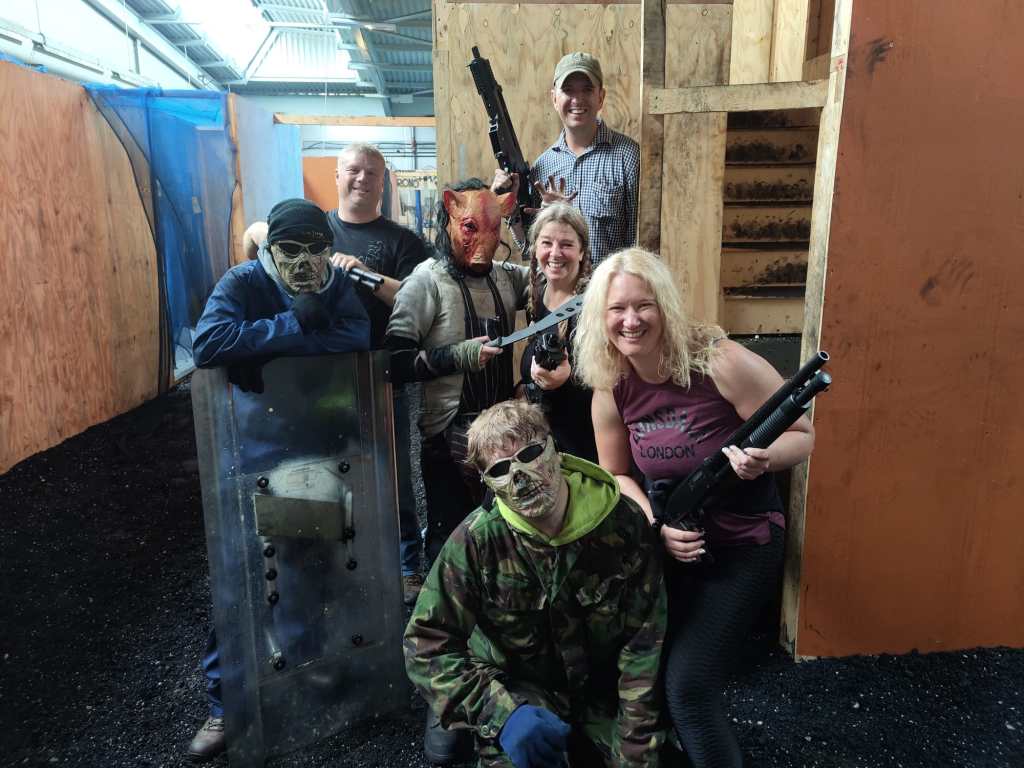 Mr Nomad and I, along with our two compatriots were armed to the teeth with assault (airsoft) rifles so we geared up ensuring our back packs were in place to collect further items which had been scattered around. We were to enter the area to retrieve biohazard bags, mobile phones and a lap top, amongst other treasures lost by those that failed in the tasks before us. This recovery mission was not without danger because we were briefed that loitering in our path would be numerous zombies all hunting us down, protecting the booty that had been dropped by our predecessors. We were informed that these zombies would not die. They mutate, re-generate and become stronger, faster and hungrier but shooting them would delay any onslaught, giving us opportunity to escape from their grip.