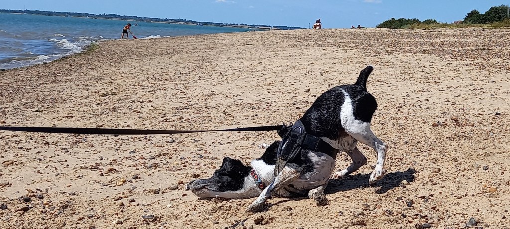 Although the winter months brought miserable conditions, we have had a glorious summer and there have been visits to Mersea island where there is a beach. Whilst I did enjoy the sandy beach in the land known as ‘up north,’ I did not enjoy this stonier beach as much as I thought I would, although Solo could not be kept out of the sea, much to our parents’ amusement. He couldn’t resist rolling in the sand after a swim and he smelled really bad. I found his hunting for seaweed to be slightly repulsive. I could not embrace the bitterly cold North Sea though and opted to sulk on the shore.