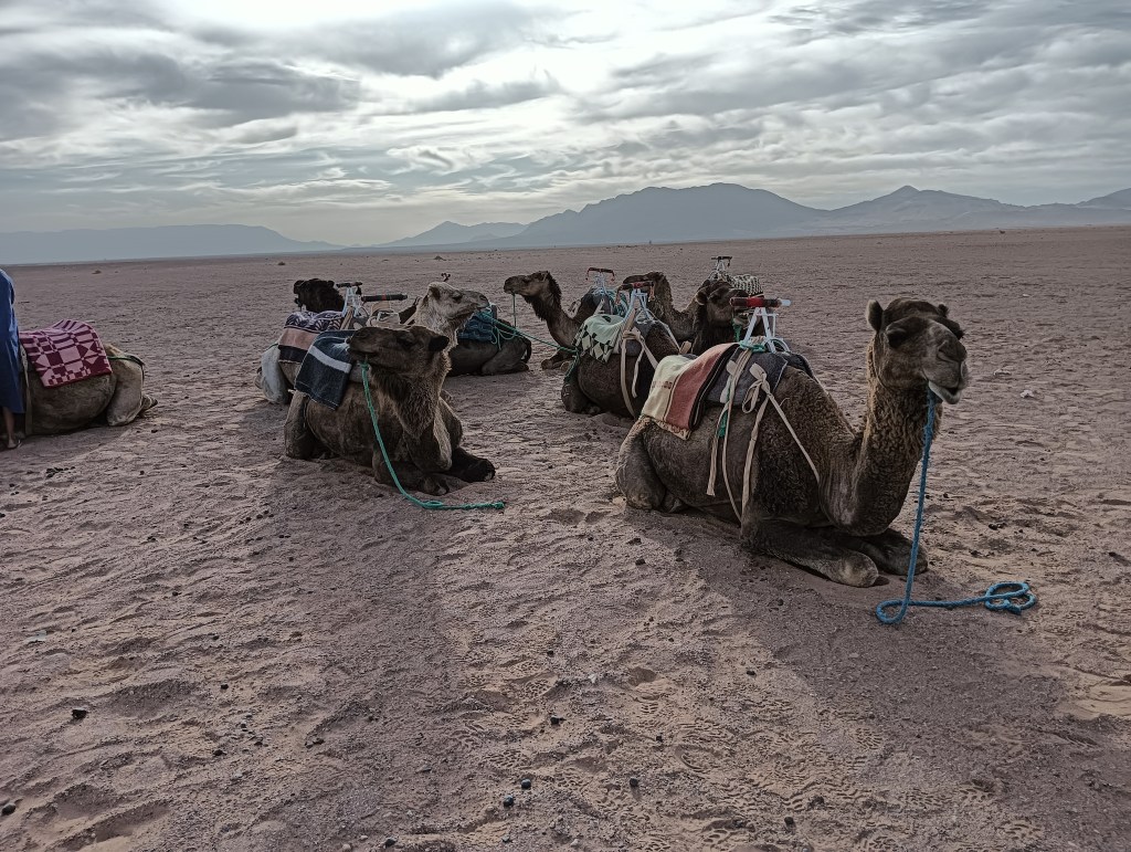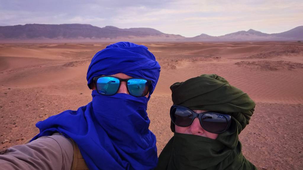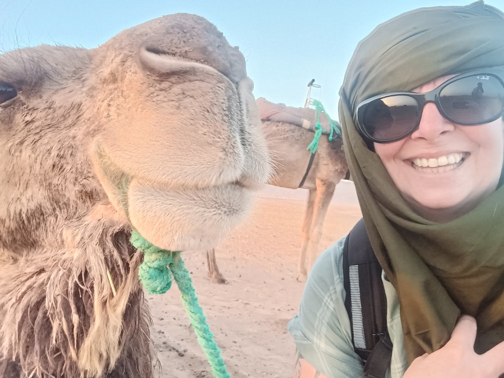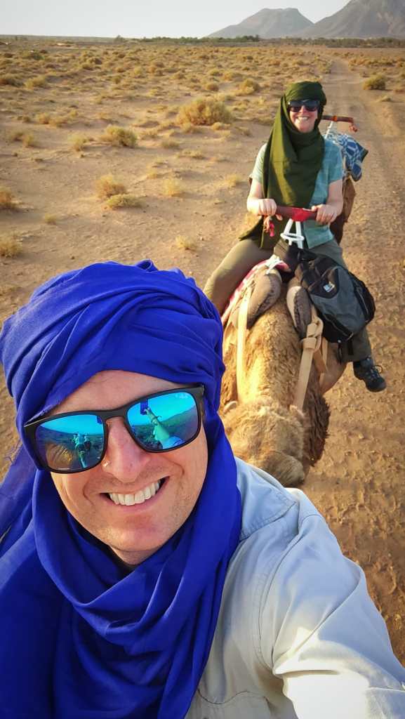 We rode into the Great desert on a camel which was wonderful. My camel was called Alihassan but Mr Nomad preferred to call him Geoffrey. I have ridden thousands of horses and ponies in my life time, but never a camel and although a very different and slightly weird experience, it was a fantastic and traditional way to enter this alien landscape. It was barren, and seemingly devoid of flora and fauna and like another world. The Sahara is distinctly rocky, with frequent gusts of wind creating giant sand dunes. The camels made short work of this, their huge splayed 3 toed feet perfect for striding across an ever shifting surface. We sauntered along, our heads wrapped in a traditional headdress adorned by the Berber people and no doubt the infamous Bedouin folk and was literally a life saver whilst the sun beat down upon us and the wind whipped up the sand, stinging the eyes and chapping the lips. Although there is little wild life, the sand seemed to take on a life of its own, swirling in the wind, building up into the dunes which this backdrop is famous for.