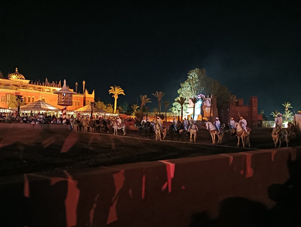 Following the meal, we were ushered out into a large arena where chaos reigned supreme with galloping horses thundering around the arena, coming to an abrupt halt with their riders gleefully shooting their rifles into the night sky, much to our shock! The riding skills on display were breathtaking, the horses seemingly fearless in the furor of gun fire. There was much noise with loud gunshots and the excited whooping and squealing from the horsemen. The outfits were garish and colourful, and the show in general was a real spectacle which in my mind, epitomized Marrakech and was exactly what I had come to expect from this crazy city.